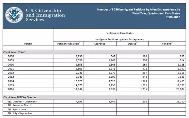 从2017财年Q1季度的最终等待案件来看,I-526共有23,250个pending案件,这意味假设您今年年初递案了,在您前面排队的有23,250 个案子。如果您想计算排期,算法就是和pending的数量、通过率、每年签证量有关!