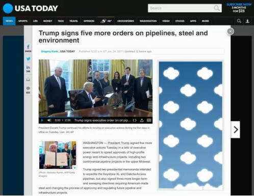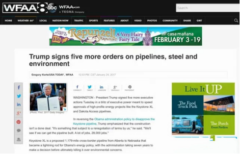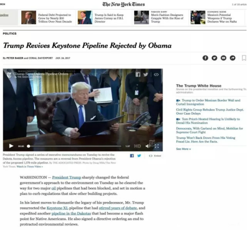 在2017年1月24日,新总统特朗普上任第一周即连续签署了五个总统命令,其中两个命令批准了Keystone XL石油管道和Dakota Access Pipelines达科他石油管道。这一消息获得了全球媒体的巨大关注。