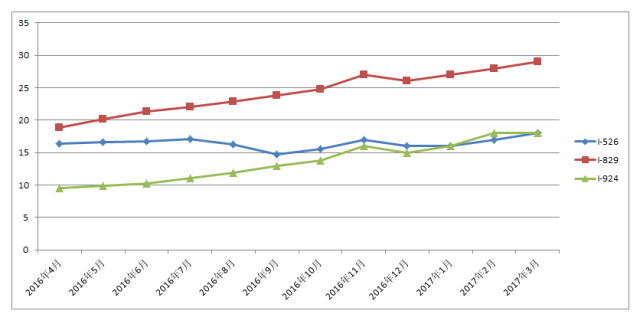 3. 比起2月份,3月份的审批进度,I-526前进11天,I-829前进11天,I-924前进一个月;